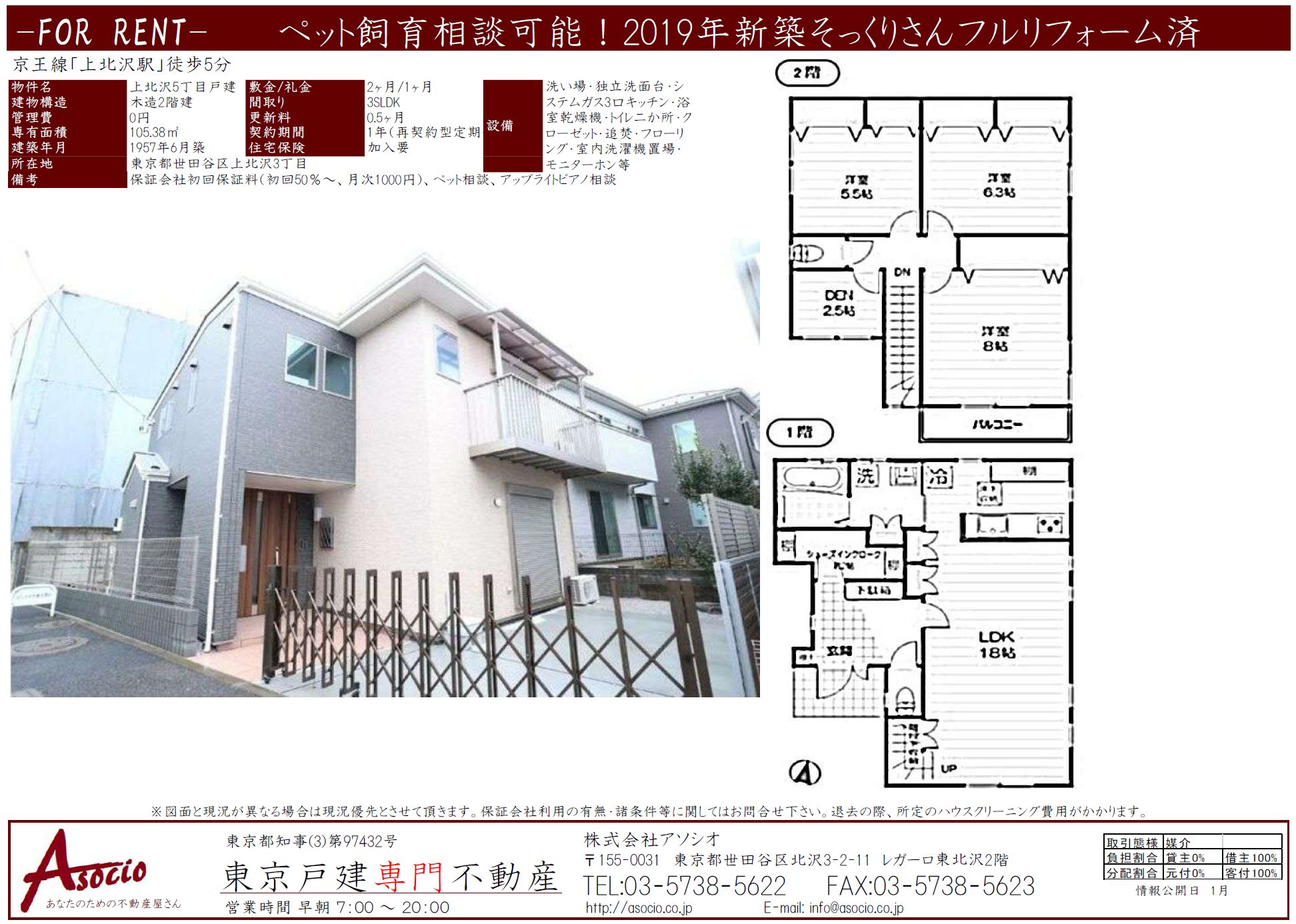 | 物件名 | 上北沢3丁目戸建 | 敷金/礼金 | 1ヶ月/1ヶ月 | ||||