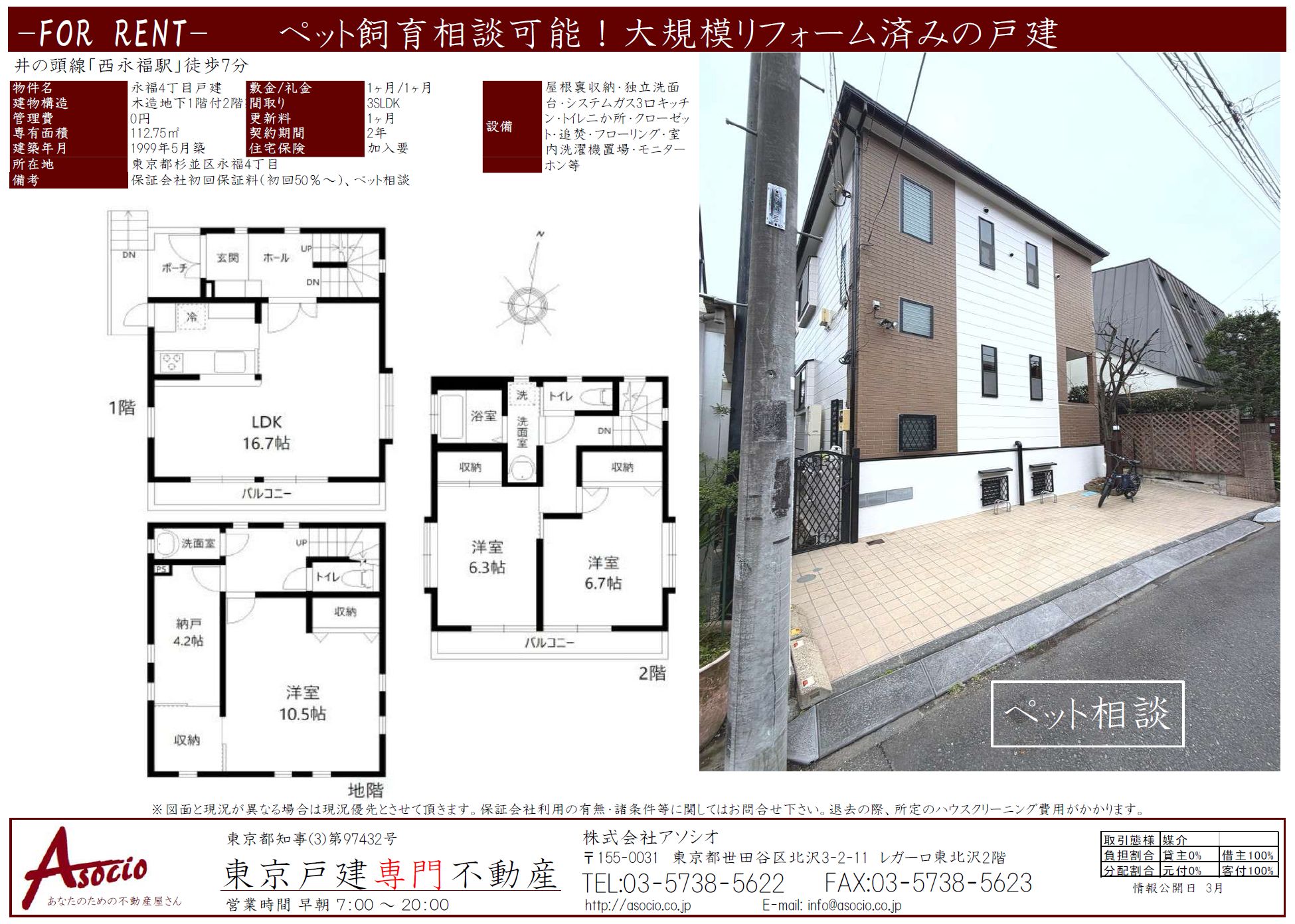 西永福駅の戸建賃貸【杉並区永福4丁目戸建】29.5万円 3SLDK(入居者募集中)